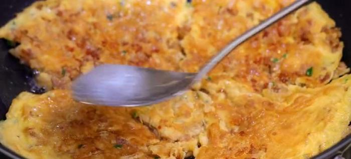 小的時候,家裡孩子多,也不可能經常有大魚大肉吃,我媽就會做肉末煎蛋給我們吃。這樣子來回的給它翻兩下,肉末煎蛋也就熟了。
